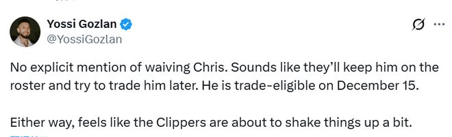 薪金专家戈兹兰指出,快船在官宣这一劲爆消息的声明中,并未提及“裁掉保罗”的相关表述。“声明里没明确说要裁克里斯,听着像是他们会先把他留在阵容名单里,之后再尝试交易。他12月16日就能被交易了。不管怎样,快船这是要开始搞点大变动了。”
