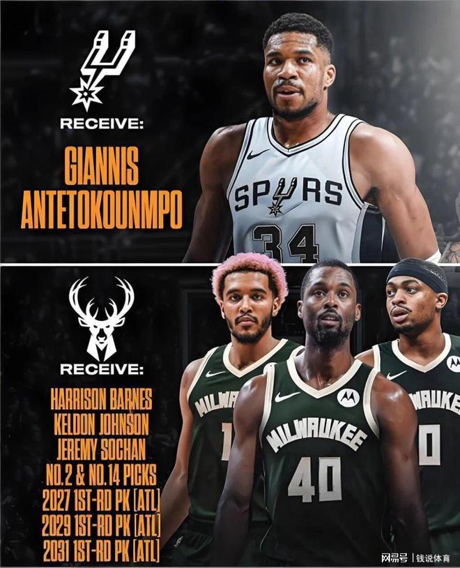 马刺为求字母哥,甩出了堪称“倾队豪赌”的8换1报价,诚意足以让雄鹿心动。这份报价囊括三位即战力核心:索汉、巴恩斯与约翰逊,再加上今年榜眼秀迪伦·哈珀、14号秀卡特·布莱恩特,以及未来3个首轮签——这几乎是将球队未来五年的核心资产全盘奉上。