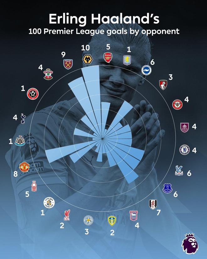 哈兰德英超100球分布:狼队10球最多,西汉姆9球、曼联8球