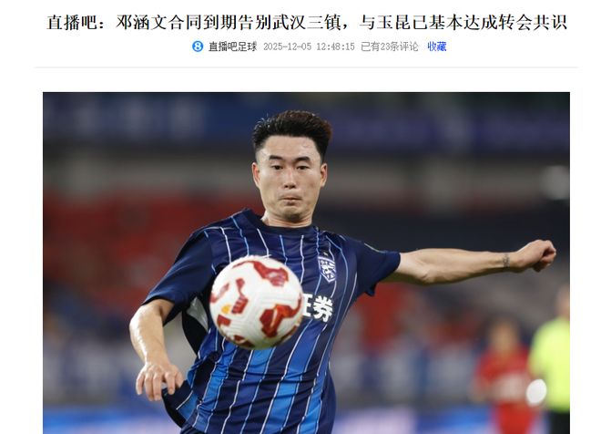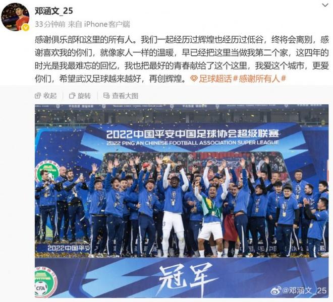 这还不止,据《直播吧》独家消息,邓涵文在合同到期后,他将会告别武汉三镇,新赛季有望加盟云南玉昆,而就在昨天(12月4日),邓涵文在社媒上已经正式与武汉三镇告别,他表示在武汉三镇这四年的时光,是他最难忘的回忆。